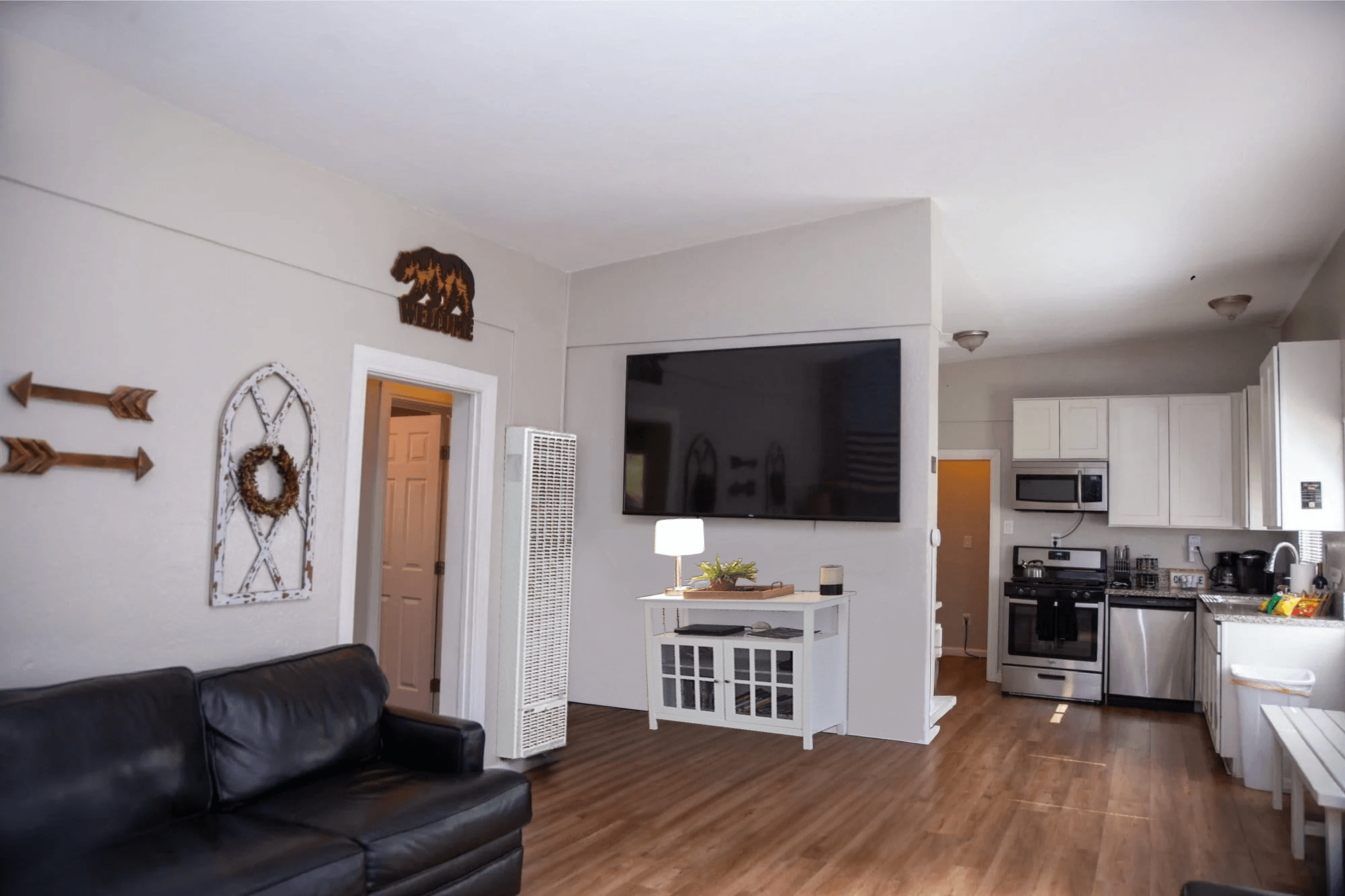 Living Room See On Floor Plan Comfort and RelaxSpacious open living with two full size sofas to relax and enjoy conversations. More Sleeping AreaThis comfortable sofa is also a great sofa bed. To get away from the one snoring. Or for the kids to have a sleep over and watch a movie. EntertainmentLarge smart Roku TV.Childrens DVD movie library below in the cabinet.WiFiInternet AccessDVD Movie LibraryNinetendo ConsoleAll remotes are kept and belong in the wood tray Open KitchenLarge open space to the kitchen for the cook to still be a part of the group.Easy path from the living room through the kitchen and down the hallway to the backdoor, without interrupting the chef.Ready for a getaway? Let's Book it! Book Direct VRBO AirBNB Book BigBear-Rental.com Direct Save when booking direct for a minimum 3 night stay with Promo “BOOK-3” for a 15% discount.